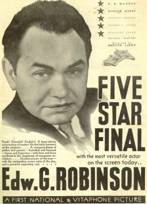 Жанр:Фильмы, Драмы, Криминал Оригинальное название: Five Star Final Год выхода: 1931 Страна: США Режиссёр: Мервин ЛеРой В ролях: Эдвард Г. Робинсон, Мэриэн Марш, Х.Б. Уорнер, Энтони Бушнелл, Джордж Э. Стоун, Фрэнсис Старр, Она Мансон, Борис Карлофф, Элин МакМэон, Оскар Апфель